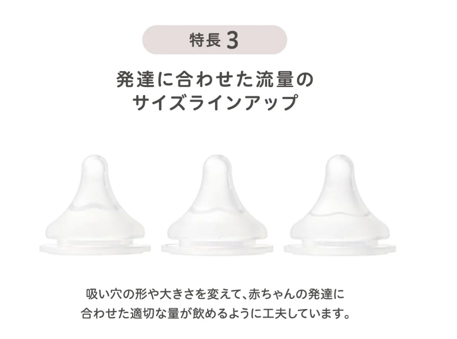 メリット:月齢に最適化された設計SS, S, M, L, LL, 3L…と、赤ちゃんの成長と吸う力に合わせて、最適な量のミルクが出るように乳首のサイズ(穴の形)が細かく設計されています。その時々の「飲みやすさ」を追求できるのが最大の強みです。
